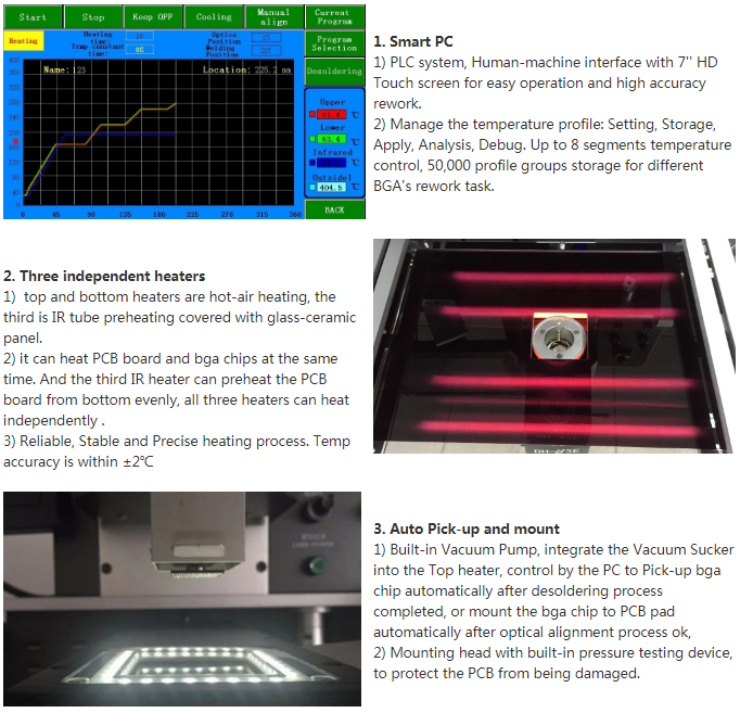 2.Manage temperaturprofilerne: indstilling, opbevaring, applikation, analyse, debug.Up til 16-segmentets temperaturregulering, 100.000 grupper opbevaring til forskellige BGAs omarbejdningstemperaturprofil.